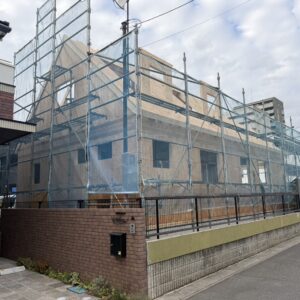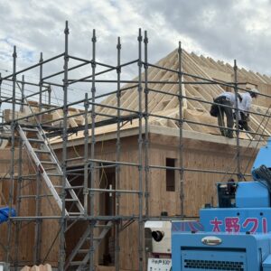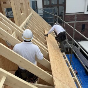 2025-11-11 スタッフブログ 茨城県 輸入住宅 流山市 I様邸 流山市 I様邸の現場です。 本日、建て方工事2日目です。天気も穏やかでスムーズに進めることができました♪ 屋根垂木を組み上げ、野地合板張りを進めています。 野地合板張りを進めた後、ドーマー屋根の工事へと進めていきます。 TOMO 茨城県 輸入住宅 流山市 I様邸